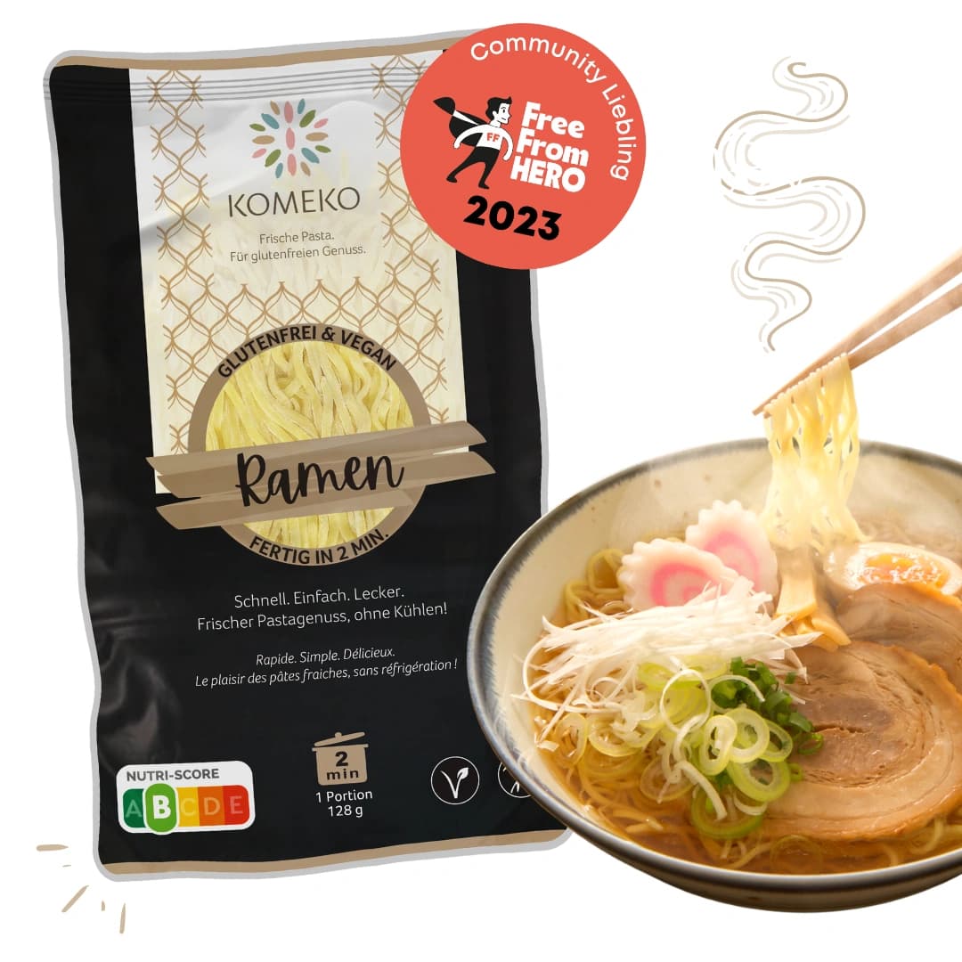 Komm mit den KOMEKO Ramen in den Genuss von frischen Ramen, die glutenfrei sind und nicht gekühlt werden müssen. Das japanische Soulfood genießt ihr am besten zusammen mit einer würzigen Brühe, knackigem Gemüse und verschiedenen Toppings. Ob veggie, vegan oder traditionell – ihr entscheidet. Auf die Stäbchen, fertig, los! Dank der Herstellung ohne Ei sind die Nudeln ungekühlt lange haltbar. Einfach und gelingsicher im Nu - die frischen Ramen haben eine Kochzeit von nur 2-3 Minuten. 🍚 Allergenarm🌱 Glutenfrei & vegan🍜 Bissfest & vielseitig⚡ Schnell gekocht