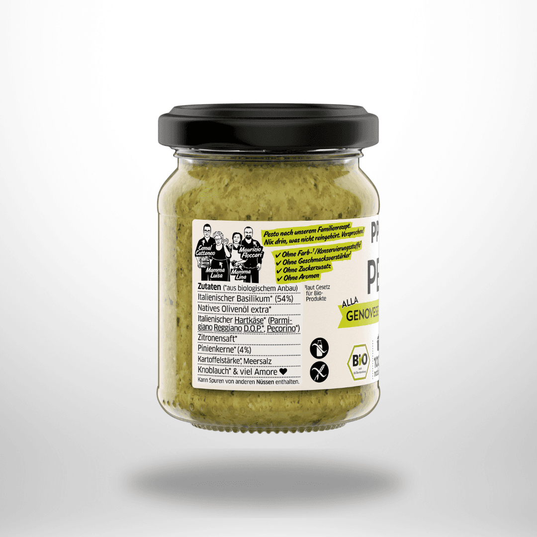 Pesto alla Genovese mit Pinienkernen! Das Bio-Pesto alla Genovese von PPURA ist der Pesto-Klassiker Italiens und kommt bei PPURA u.a. mit den Zutaten des Originalrezepts aus Genova ins Glas: Kleinblättriger italienischer Basilikum, gereifter Parmiggiano Reggiano, würziger Pecorino Romano, Pinienkerne und natives Olivenöl extra. Und das alles bio und 100% natürlich. Das heiß,t PPURA verzichtet auf Zuckerzusatz, Farbstoffe und künstliche Zusätze. Wie bei Mamma eben. Buon Appetito.