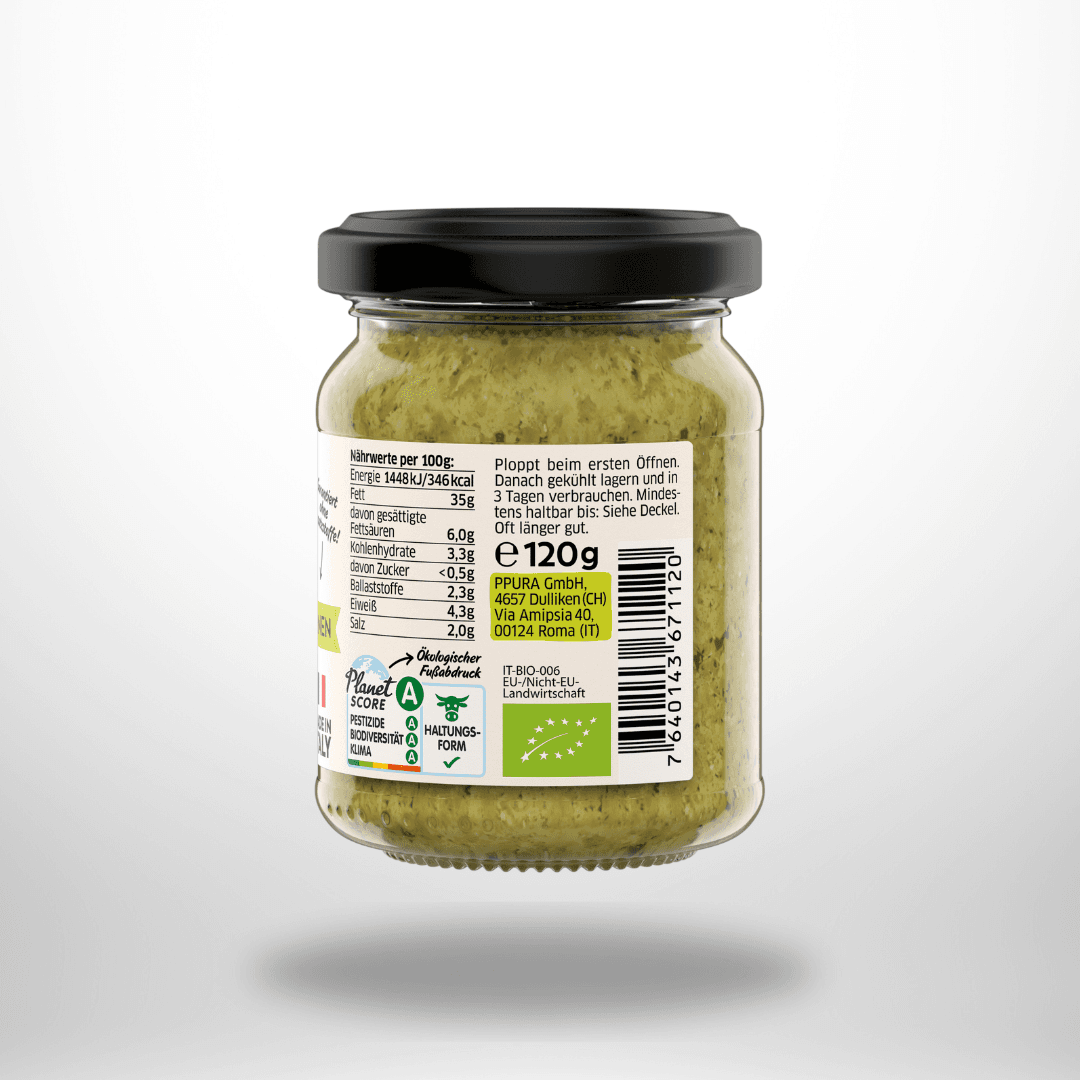 ital. Basilikum (54%)*, natives Olivenöl extra, Ital. HARTKÄSE (Pecorino*, Parmigiano-Reggiano D.O.P.*, Pecorino), Zitronensaft*, Pinienkerne (4%)*, Kartoffelstärke, Knoblauch*, Meersalz und viel Liebe. *aus biologischem Anbau