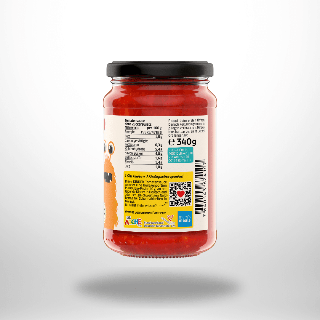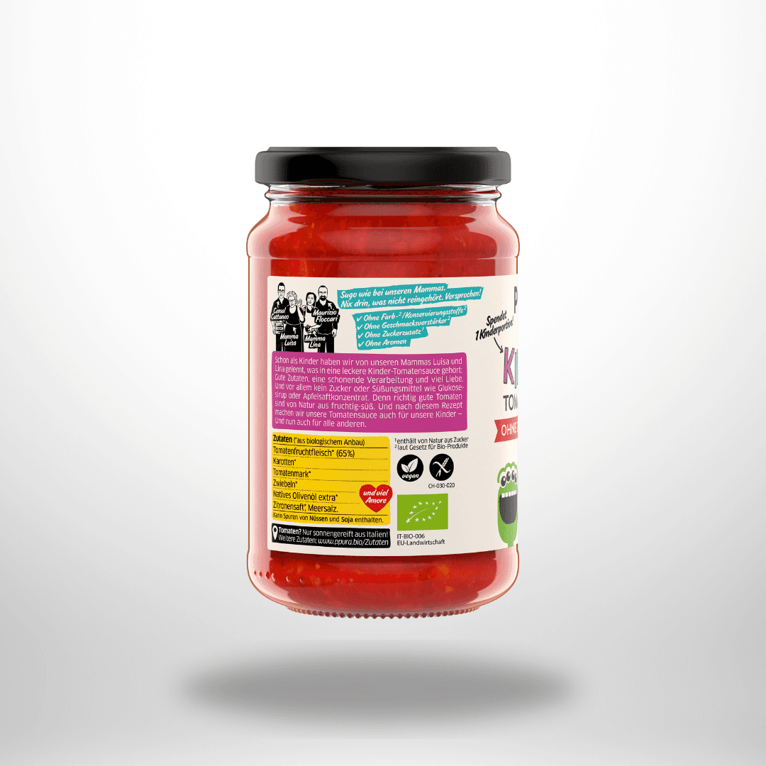 Schon als Kinder haben die PPURA-Gründer von ihren Mammas Luisa und Lina gelernt, was in eine leckere Kinder-Tomatensauce gehört: Gute Zutaten, eine schonende Verarbeitung und viel Liebe. Und vor allem kein Zucker oder Süßungsmittel wie Glukosesirup oder Apfelsaftkonzentrat. Denn richtig gute Tomaten sind von Natur aus fruchtig-süß. Und nach diesem Rezept macht PPURA die Tomatensauce auch für die eigenen Kinder — Und nun auch für alle anderen: die PPURA BIO Sugo Kinder - Tomatensauce ohne Zuckerzusatz & ohne Stückchen.